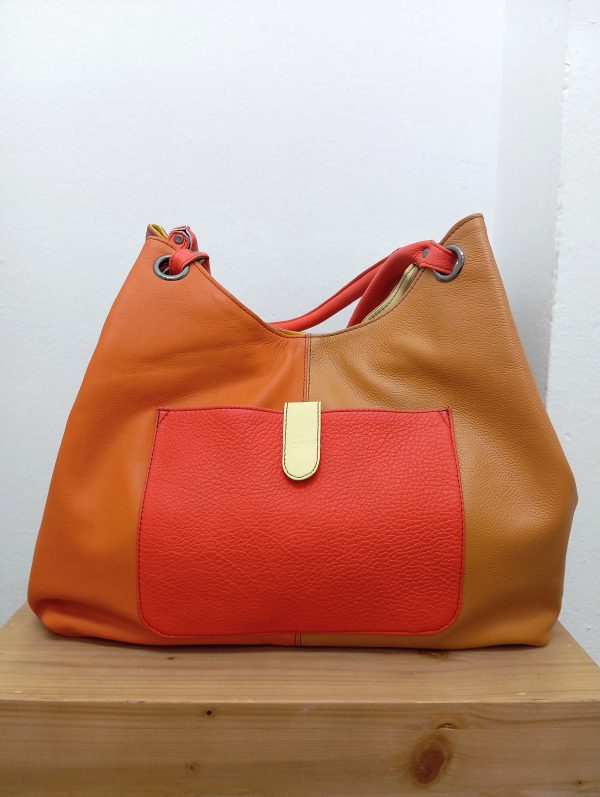 Borsa a spalla di grande misura e mono tono. La chiusura della borsa è a magnete e, sugli altri due lati della borsa, è presente anche un gancio che può contribuire a tenere la borsa più chiusa o, al contrario, permettono di ampliarne la capienza e la grandezza. Due tasche esterne, una a zip e l’altra a magnete, e taschine porta oggetto all’interno della borsa, di cui una con zip.