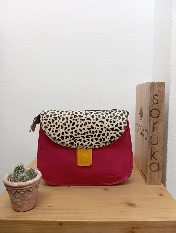 La parte di patella liscia, invece, copre uno scomparto chiuso da una zip. Tracolla in pelle regolabile.