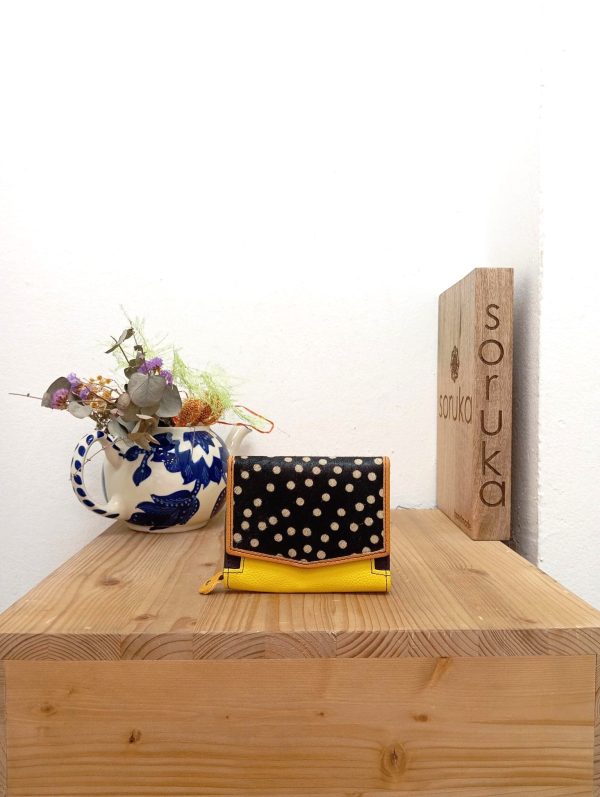 Portafoglio compatto in pelle liscia multicolore. Chiusura a magnete. Tre tasche più ampie, due intermedie, 5 spazi portatessere e due taschine portamonete con chiusura a zip, di cui una esterna.
