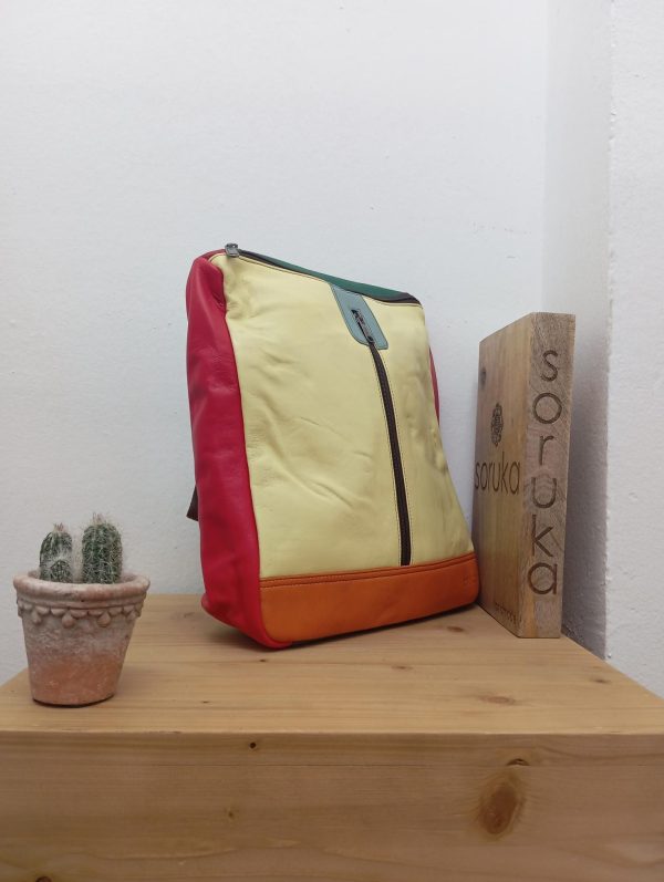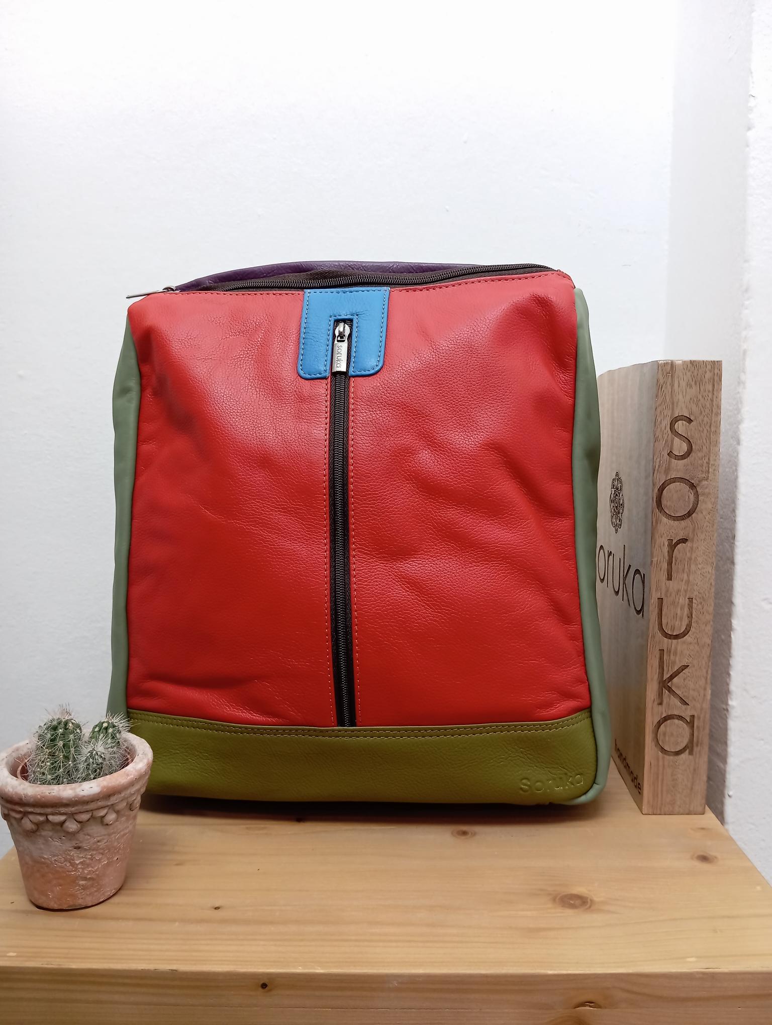 Zaino dalla forma quadrata in pelle liscia multicolore. Unico scomparto inerno con taschina con zip e due tasche esterne con zip, una frontale e una più piccola posteriore. Spalline in pelle regolabili.