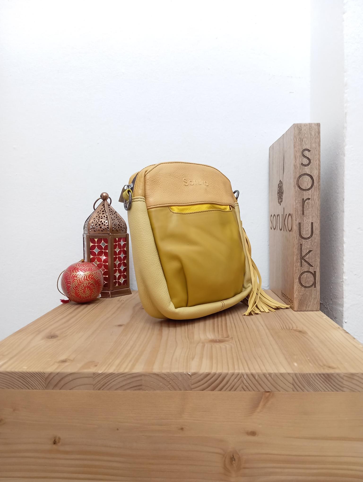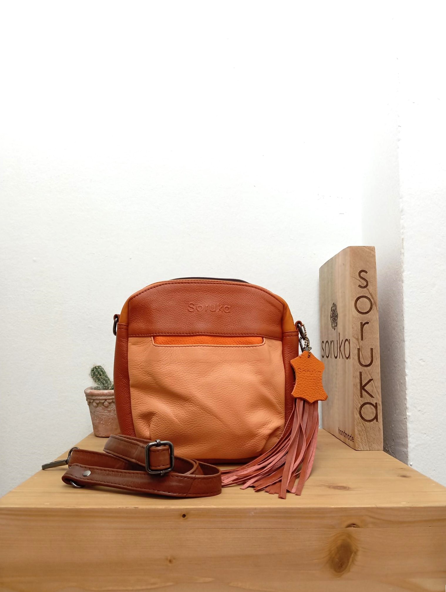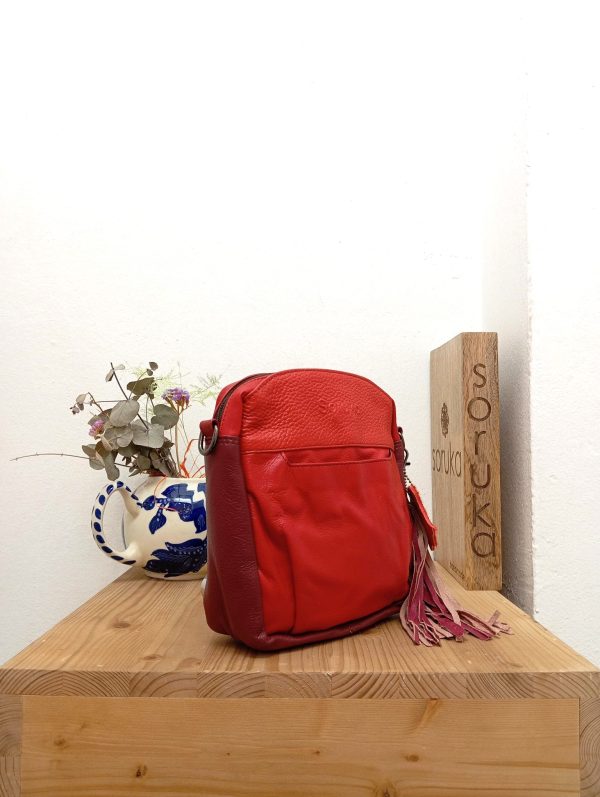 Borsello dalla forma squadrata con dettaglio della nappa removibile. La borsa presenta quattro tasche esterne, di cui due con chiusura a magnete, e uno scomparto centrale con chiusura a zip e ultriori taschine portaoggetto al proprio interno. Tracolla in pelle regolabile.