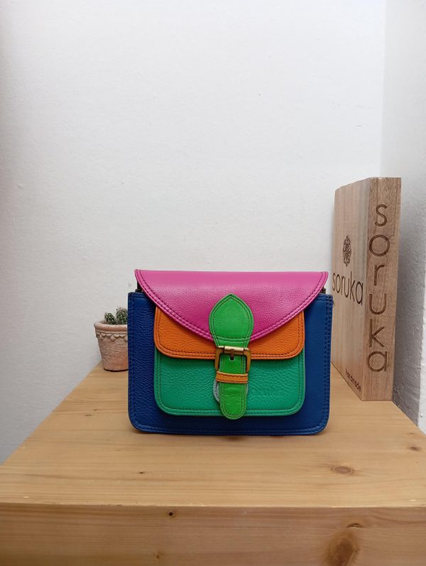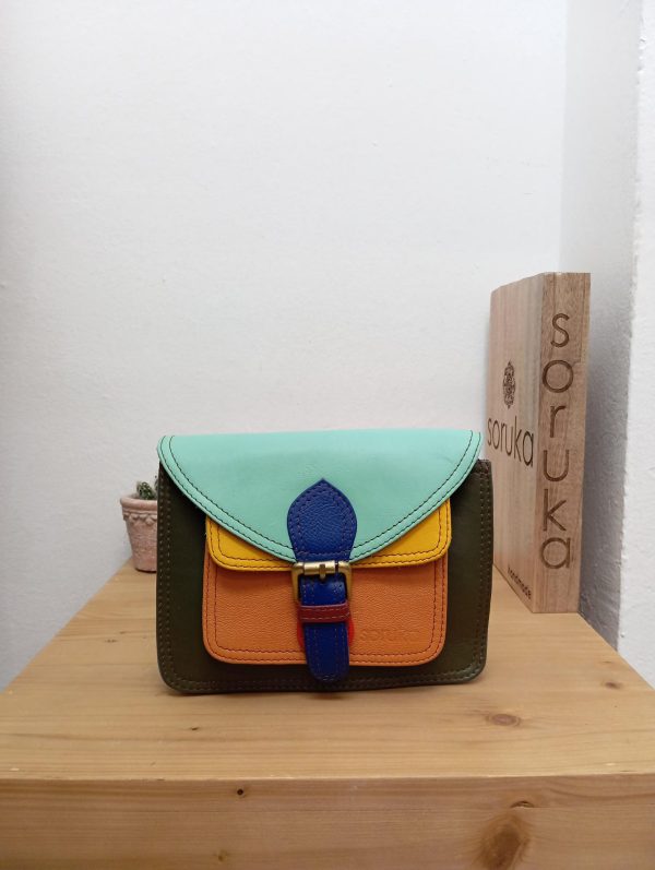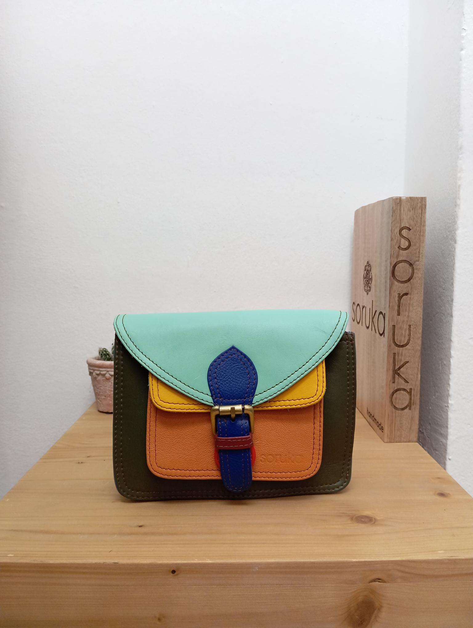Minibag squadrata composta da tasca unica più una zip all’interno e una tasca esterna con magnete a chiusura.