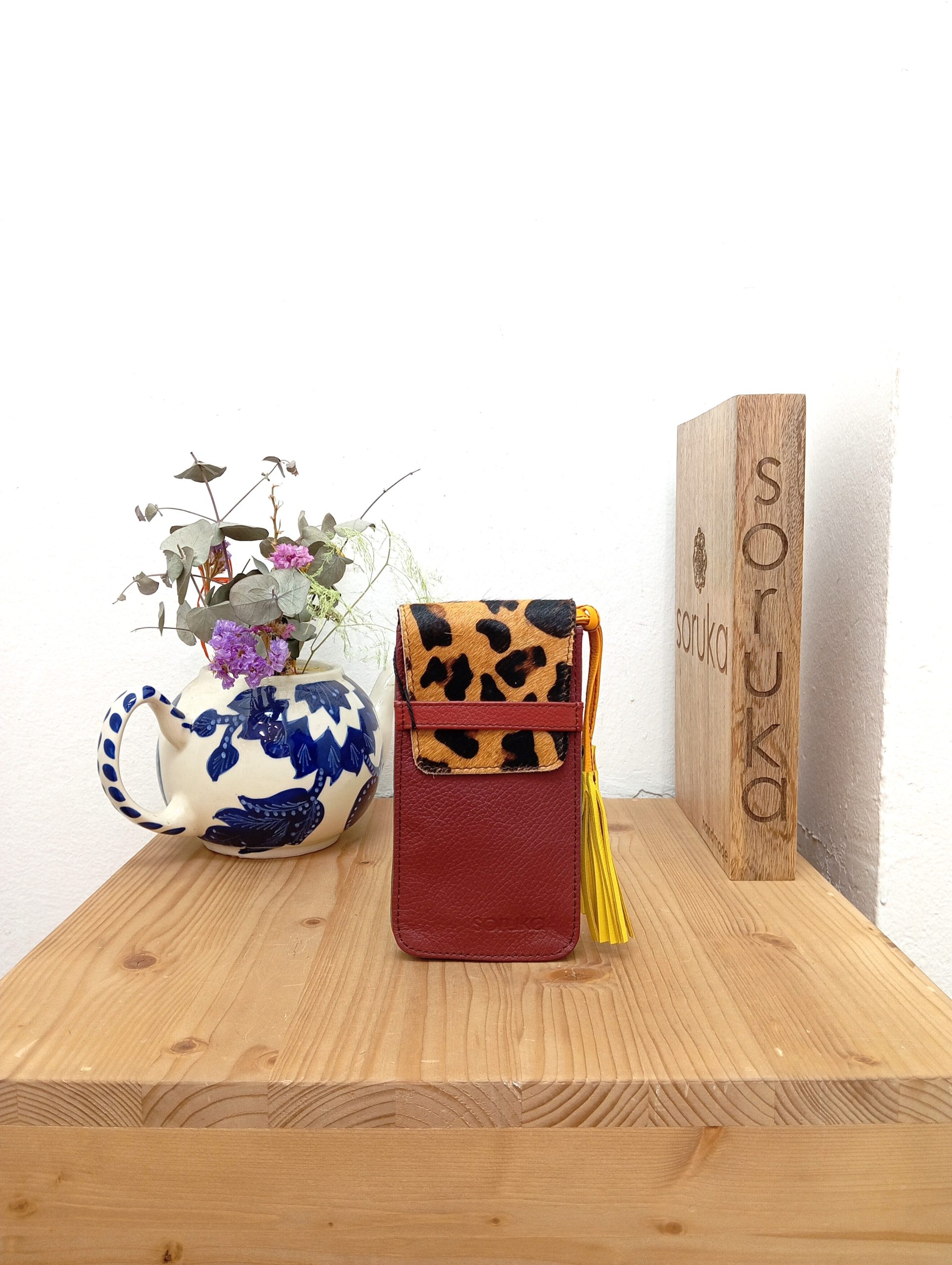Portatelefono in pelle con stampa a pelo sulla patella. Il portatelefono si chiude a incastro della patella con una striscia di pelle.