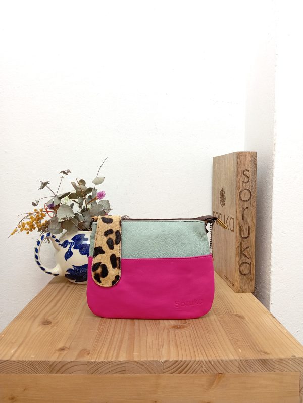| Pochette tondeggiante con dettaglio animalier e chiusura a zip. La pochette presenta una taschina interna e una esterna con zip, più una taschina esterna aperta sul davanti. Può essere portata a mano o con la tracolla in pelle regolabile. |