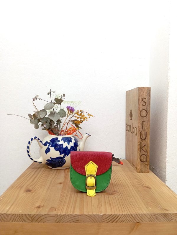 Portamonete dalla forma stondata con chiusura con zip e bottone a pressione. Fibbia decorativa e gancio sulla parte superiore.