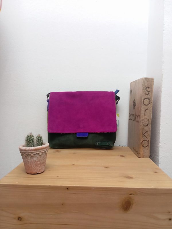 Questa morbida borsa dalla forma squadrata presenta una doppia chiusura con magnete, il che la rende una borsa a due facce semplicemente capovolgendo la patella superiore. La patella superiore si presenta con un lato liscio e l’altro con pelo. La borsa risulta divisa in due scomparti: la parte di patella con il pelo va a chiudere uno scomparto chiuso da una zip, al cui interno si trova una piccola tasca chiusa a sua volta da una zip. La parte di patella liscia, invece, copre uno scomparto chiuso da una zip. Tracolla in pelle regolabile.