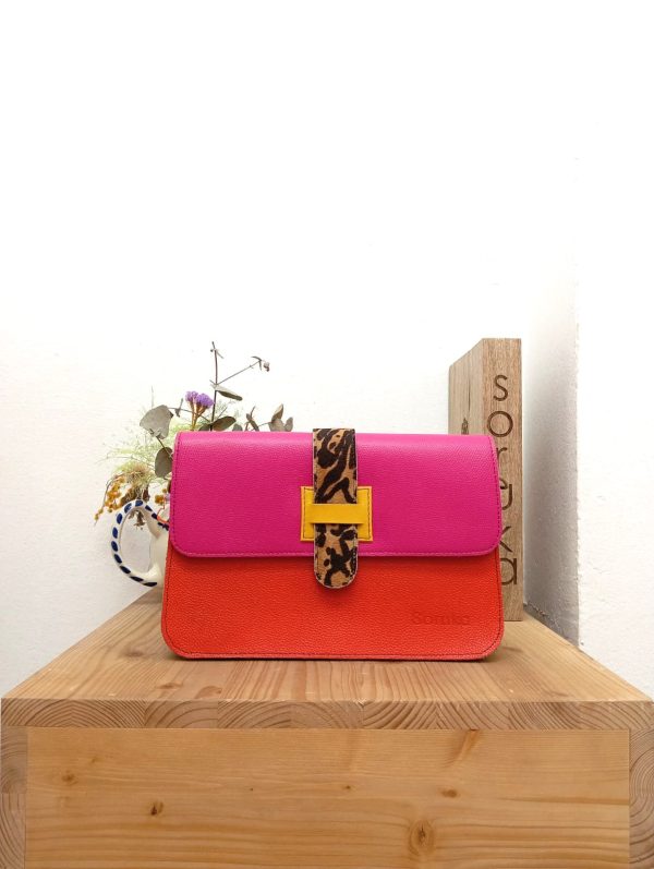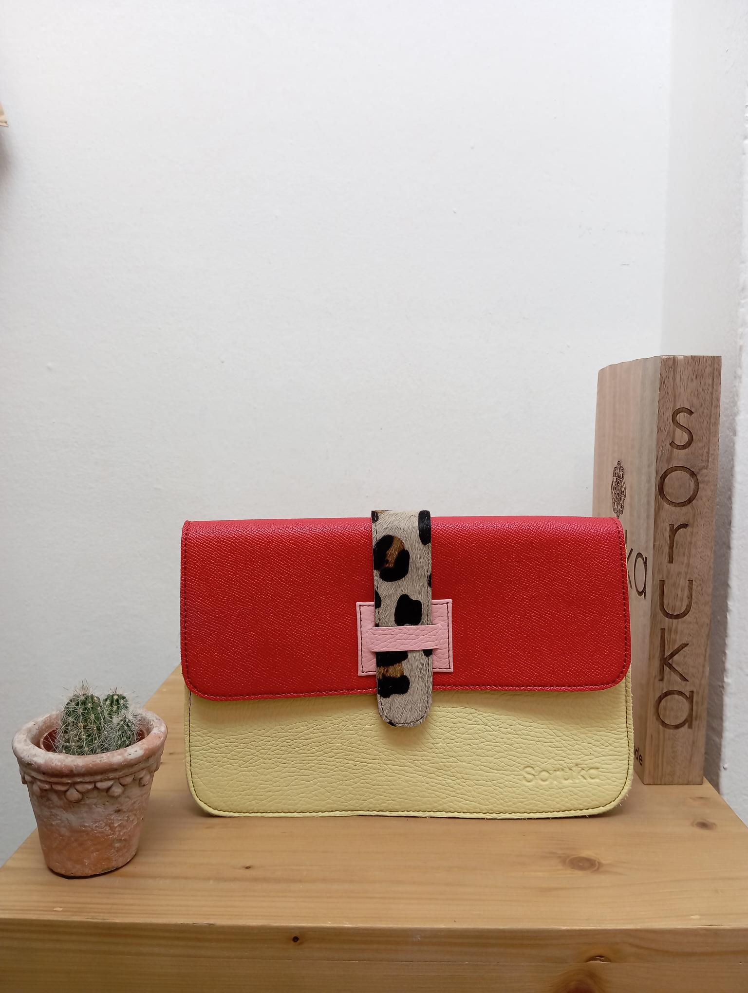 Borsa rettangolare con tre tasche distinte, in una delle quali è presente un’ulteriore taschina chiusa da una zip. La borsa ha la chiusura garantita da un magnete e la tracolla in pelle regolabile. La fascetta verticale è reversibile, con un lato in animalier e l’altro liscio.
