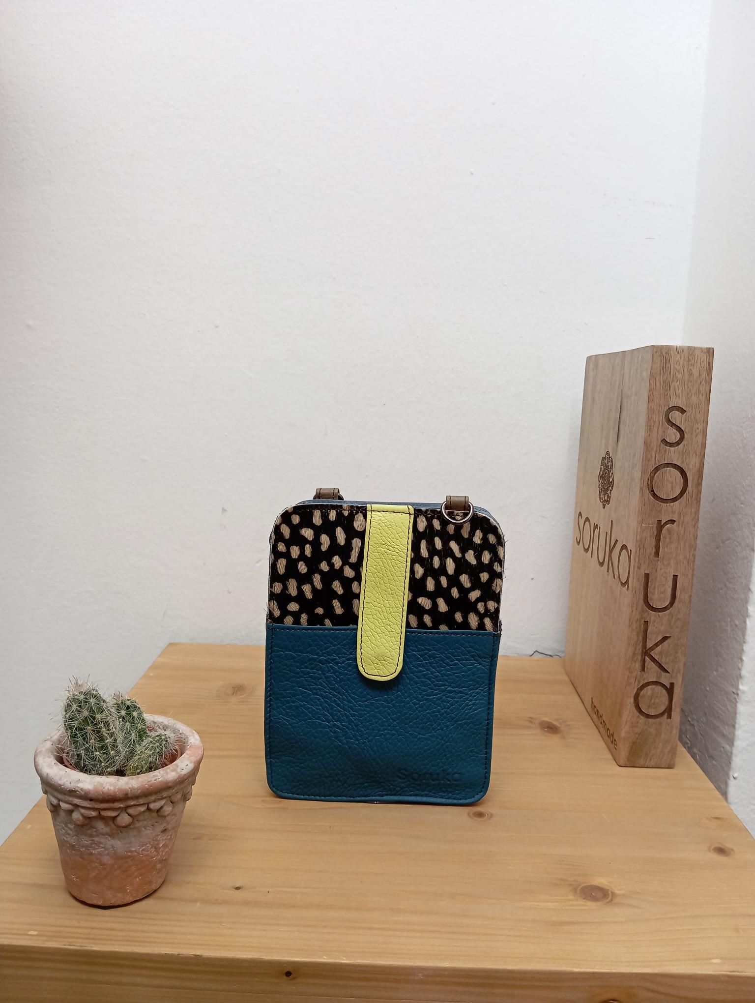Portatelefono dalla forma verticale in morbida nappa bovina. Chiusura zip e due taschine esterna, una con zip e una con bottone. Dettaglio in animalier sulla parte anteriore. Tracolla regolabile e removibile.