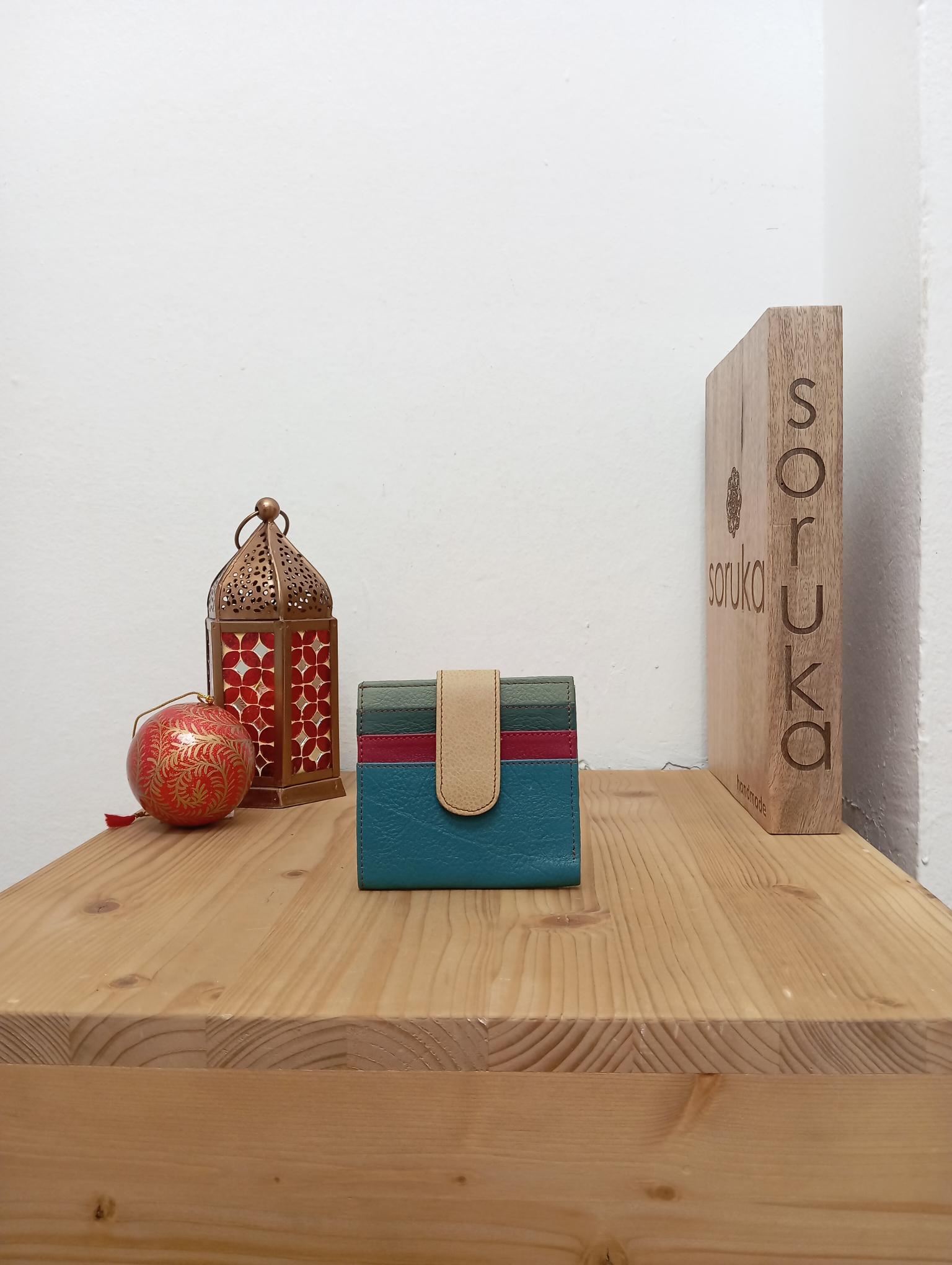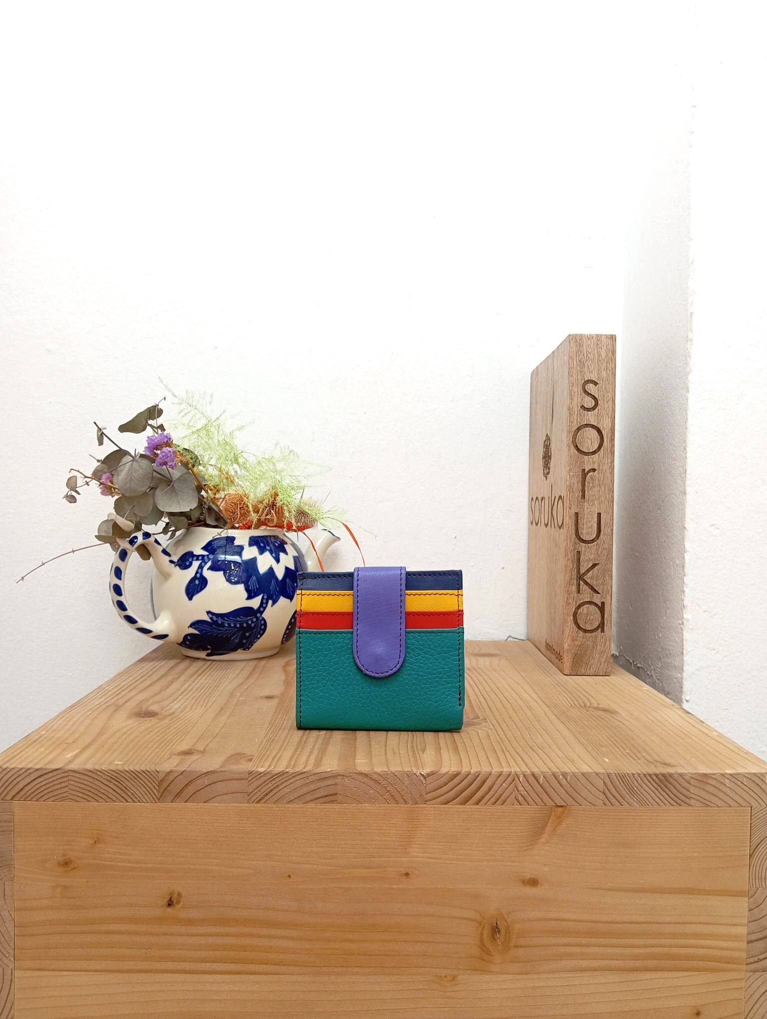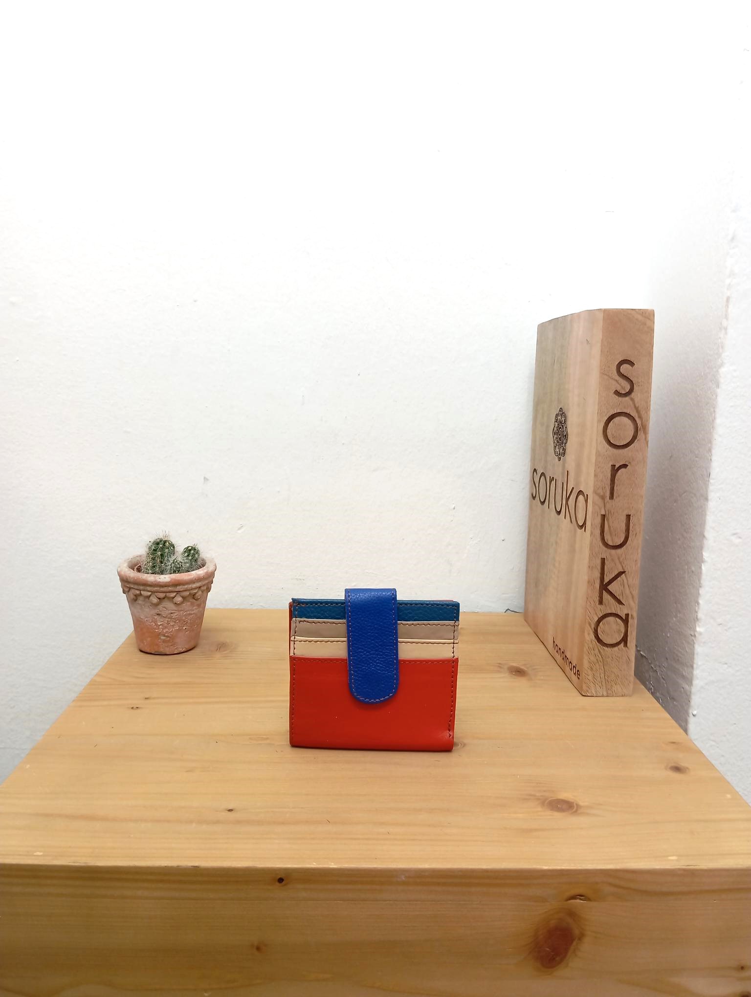 | Portafoglio compatto in pelle liscia multicolore. Chiusura con bottone a pressione. Ha una tasca per banconote e 11 spazi portatessere o documenti. |
