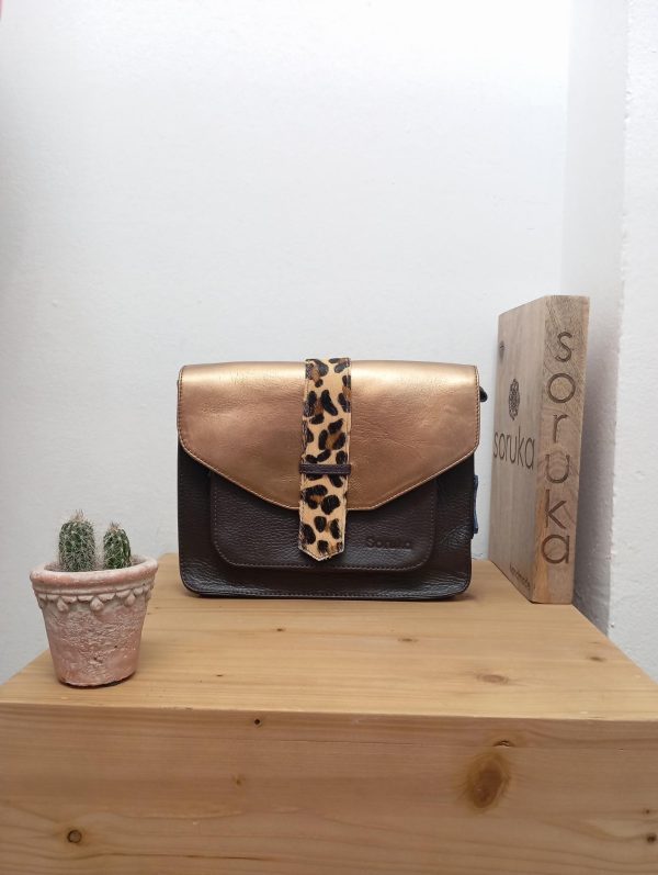Borsa dalla forma squadrata con laccetto verticale reversibile. Una tasca sulla parte frontale con chiusura a zip e una taschina interna con zip. Chiusura a magnete e tracolla in pelle regolabile. Patta glitterata. 23×27 cm.