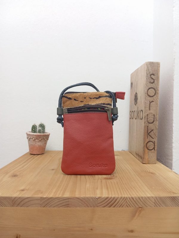 Portatelefono dalla forma verticale in morbida nappa bovina. Presenta due tasche con chiusura zip. Dettaglio in animalier sulla parte anteriore. Tracolla regolabile e removibile.