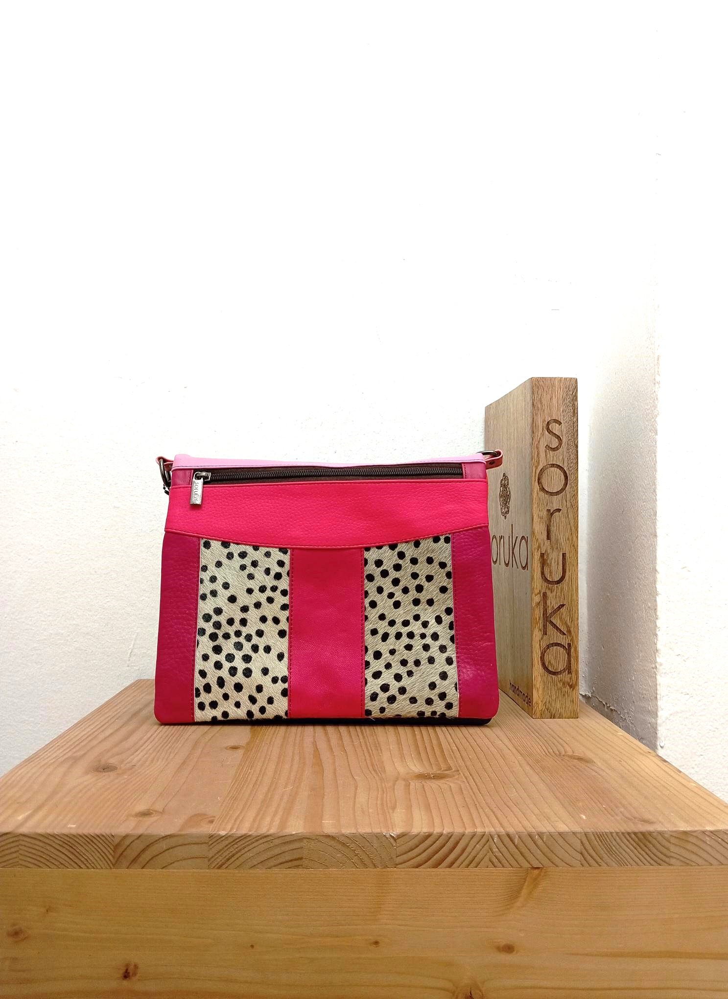 | Borsa rettangolare a quattro facce: grazie ai magneti presenti nella parte inferiore, la borsa può essere ripiegata sue due lati diversi, creando combinazioni diverse di colori. Ogni lato della borsa presenta un dettaglio animalier e una tasca, tre lati hanno la chiusura a zip e uno ha la chiusura con magnete. Tracolla in pelle regolabile. |