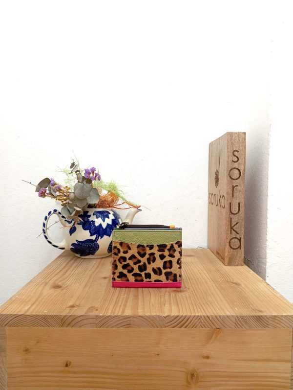 Portafoglio compatto con stampa pelo e multicolore. Chiusura con bottone a pressione. Tasca esterna, taschina portamonete, tasca per banconote, 8 spazi portatessere o documenti.