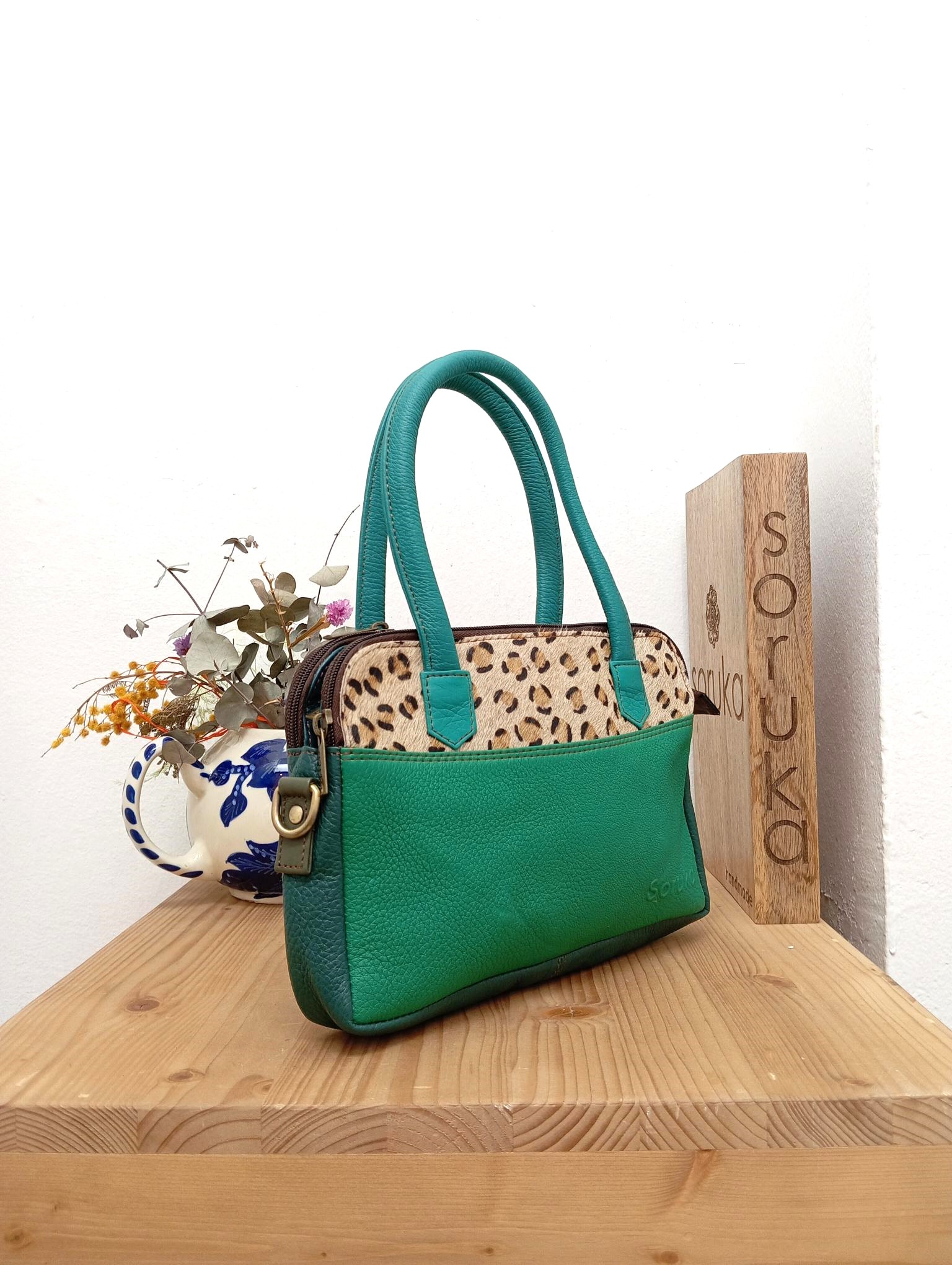 Piccola borsetta a tre tasche, ognuna con zip in chiusura. Ulteriore taschina sulla parte esterna posteriore. Dettaglio in animalier sul davanti. Manici in pelle per portarla a mano o a braccio e tracolla in pelle regolabile.