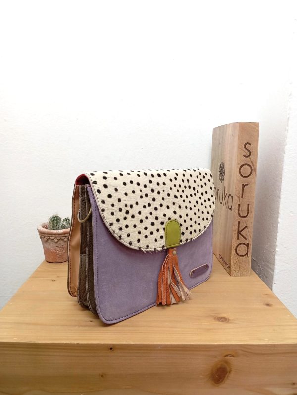 La borsa è rettangolare e scamosciata, divisa in tre differenti scomparti, con la classica tasca interna chiusa dalla zip. La chiusura è a magnete e presenta il dettaglio della nappa. La borsa è corredata da tracolla in pelle regolabile.