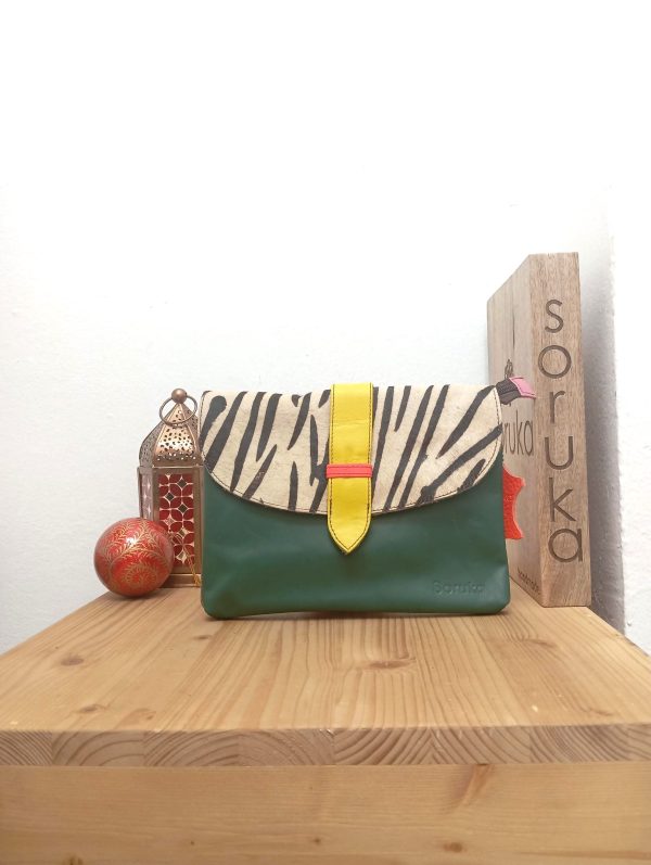 | Borsa a busta, rettagolare e piatta, con chiusura a zip e bottone, con una zip interna e una zip sul retro della borsa.. Può essere portata a mano, a polso o con la tracolla in pelle regolabile. |