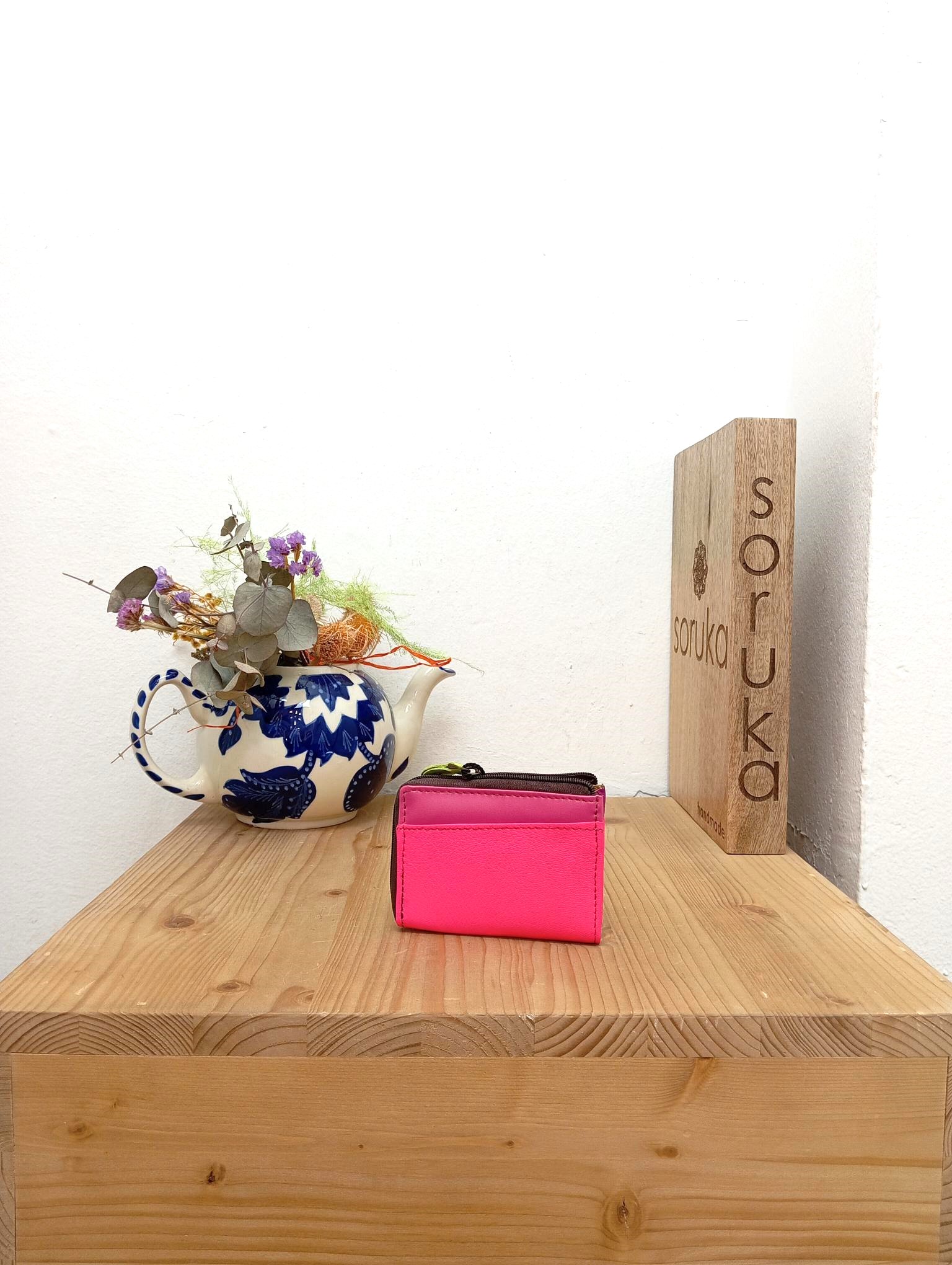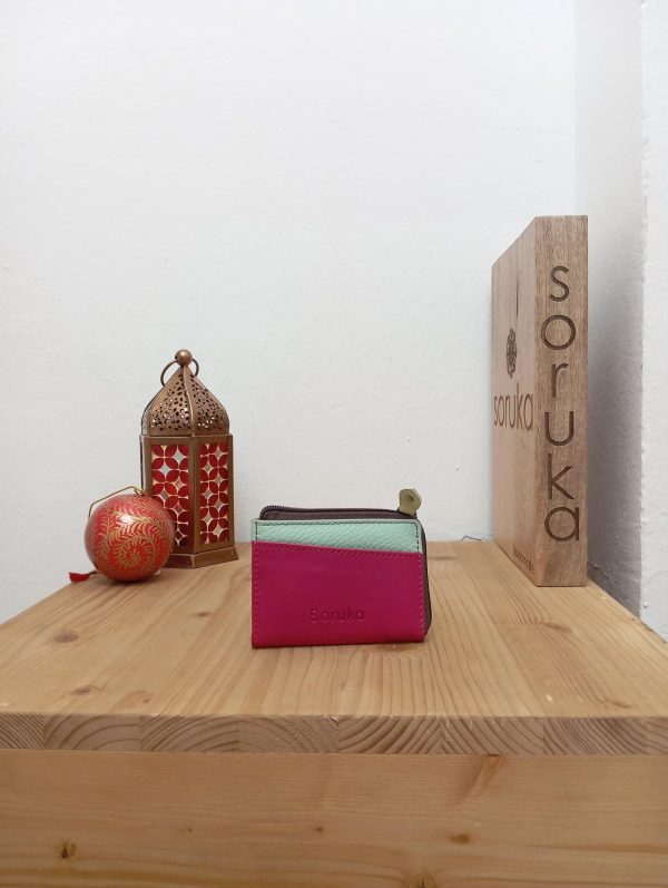 Portafoglio di piccole dimensioni con due taschine portacarte sull’esterno e cerniera a zip che apre sue taschine a soffietto portamonete e portatessere.