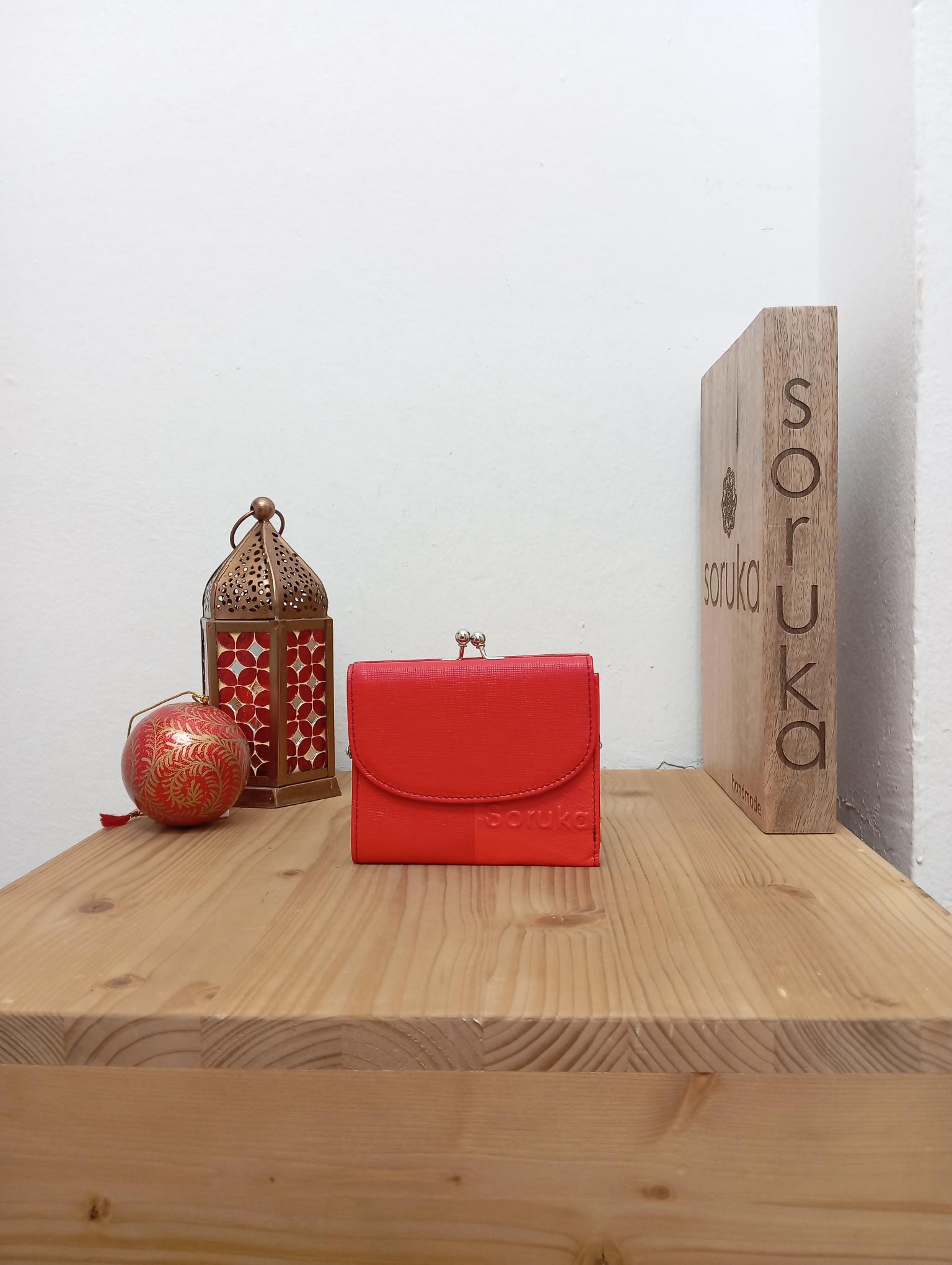 | Portafoglio monotono dal gusto retrò suddiviso in due scomparti: nel primo, che ha la chiusura con bottone a pressione, si trovano le tasche portabanconote e documenti e 8 spazi portatessere. Il secondo ha la chiusura a scatto e contiene due scomparti portamonete. |